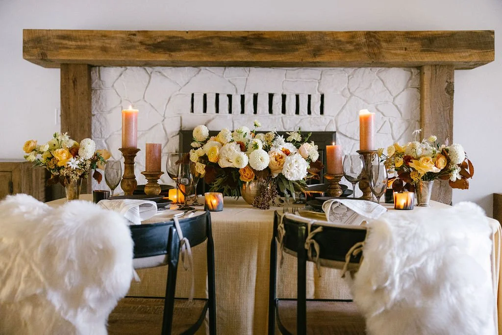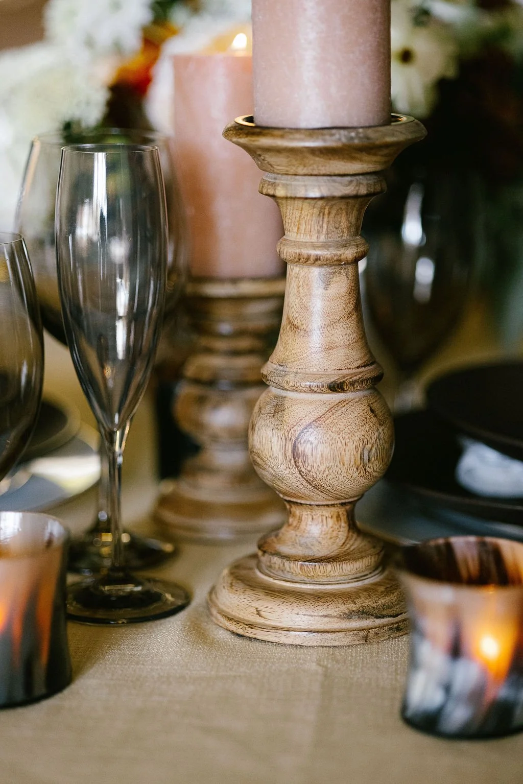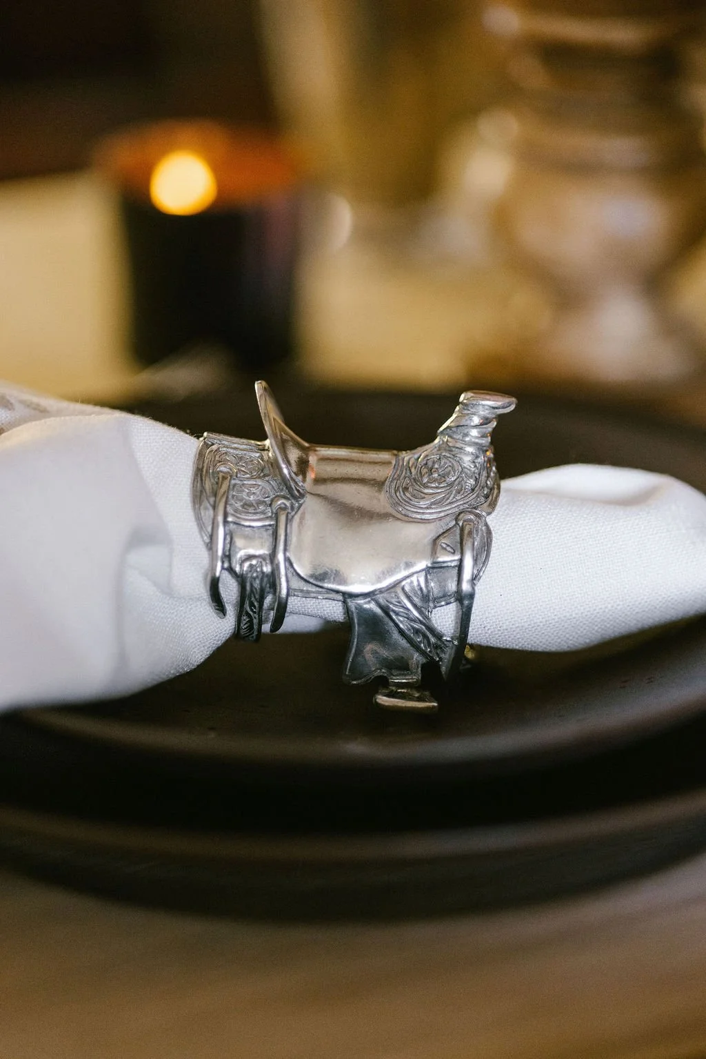 Lillian Charger | Saddle Plates | Stevie Glassware Collection | Blonde Flatware | Blonde Steak Knife | Saddle Napkin Ring | Wooden Pillar Holders | Bison Horn Votives | Sheep Skin
