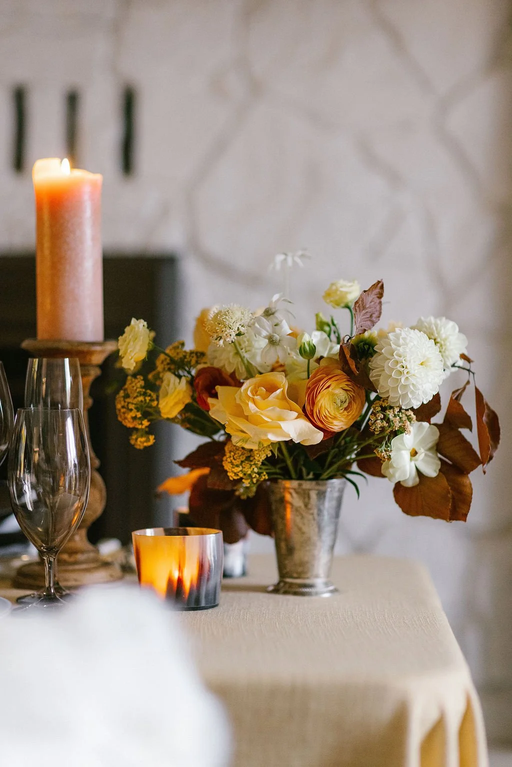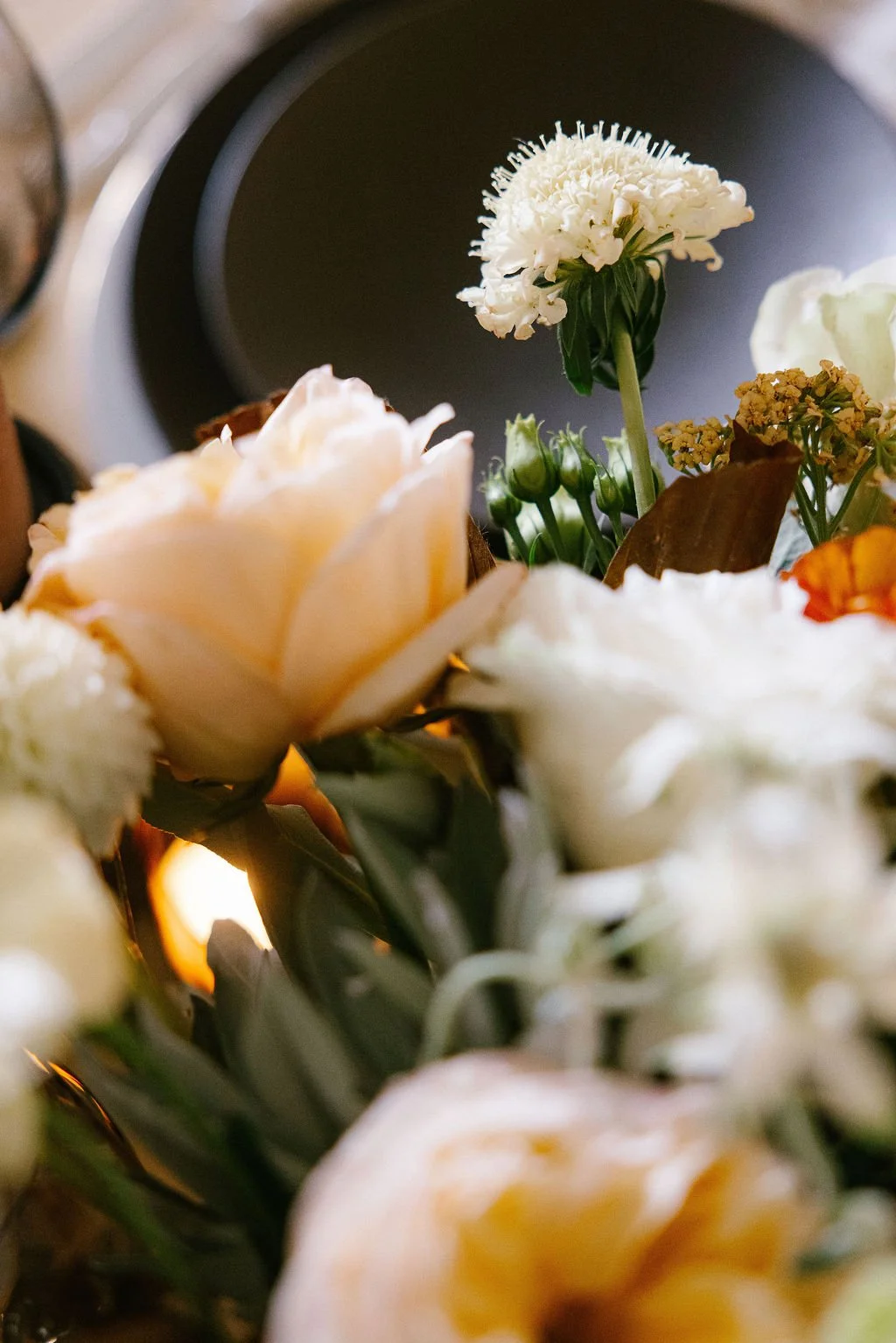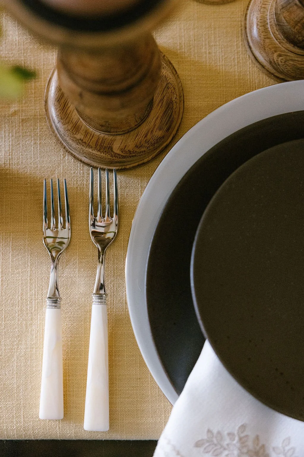 Lillian Charger | Saddle Plates | Stevie Glassware Collection | Blonde Flatware | Blonde Steak Knife | Saddle Napkin Ring | Wooden Pillar Holders | Bison Horn Votives | Sheep Skin